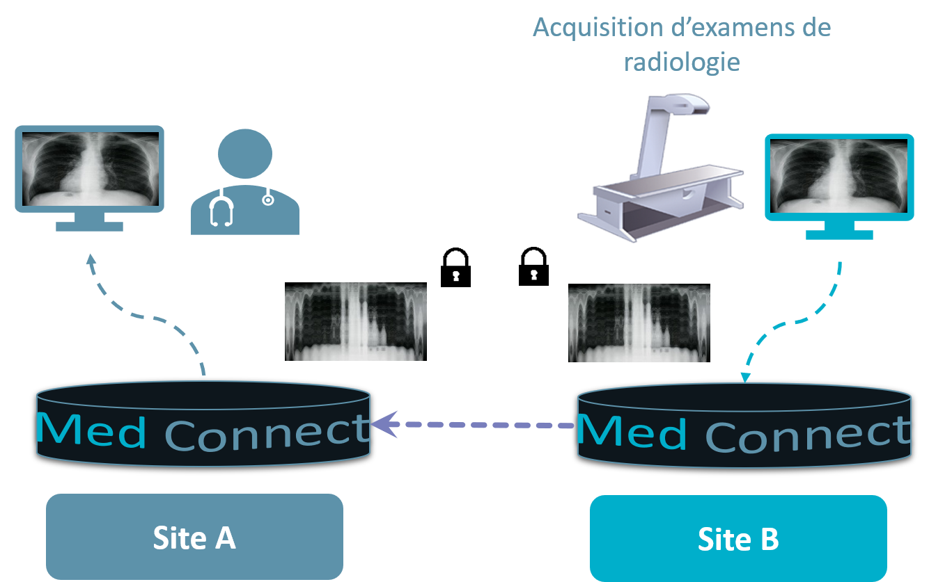 L’exemple illustré, montre comment un radiologue peut lire, sur une console de diagnostic du Site A, des images acquises en DR sur le Site B.